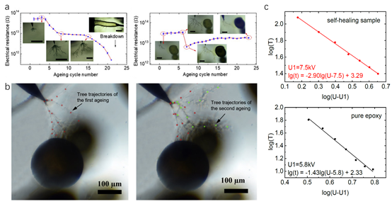 Fig. 3: Assessment on electrical properties of the self-healing material. (a) Insulation resistances of pure epoxy resin (left) and microencapsulate self-healing sample (right) in the cyclic degradation experiment; (b) Electric tree growing paths of the microencapsulate self-healing samples after the initial (left) and secondary (right) degradation experiment; (c) Insulation life curves fitted according to the degradation experimental data and wave model