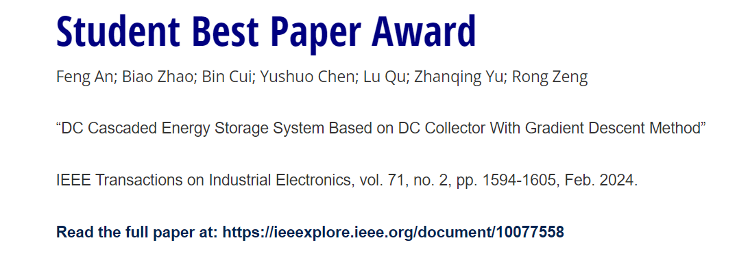 赵彪副教授作为通讯作者发表在IEEE Transactions on Industrial Electronics(IEEE TIE)的论文“DC Cascaded Energy Storage System Based on DC Collector With Gradient Descent Method”荣获2025年IEEE 学生最佳论文奖(IEEE Student Best Paper Award)。