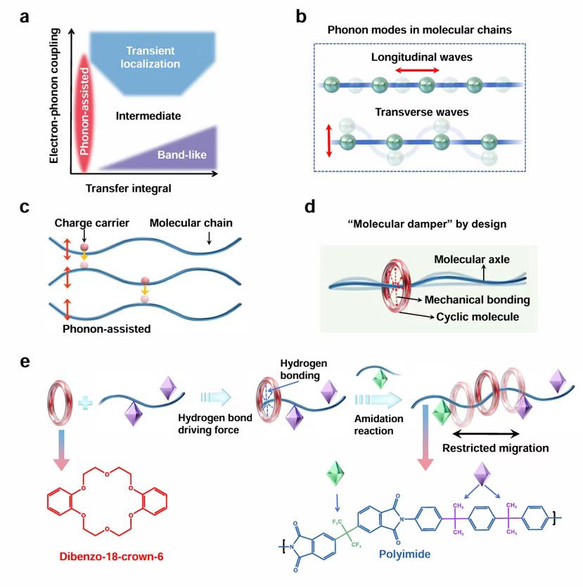 本研究揭示了介电高分子在极端高温、强电场下的声子辅助分子链间电荷隧穿传导机制,打破了传统认知的典型能带传输模式,这一物理机制在此前的耐热介电高分子研究中被忽略。研究采用超分子化学方法构建了一类具有“分子阻尼器”效应的新型聚轮烷型介电高分子材料,抑制高温下聚合物分子链的局部振动和声子辅助链间电荷转移。这种通过分子拓扑结构工程实现的“分子阻尼器”效应使得介电高分子在250摄氏度极端高温下放电能量密度超过现有商业电容薄膜室温下性能,绝缘电阻率比商业化耐热介电高分子高4个数量级以上,并且在300兆伏每米的电场强度下重复充放电10万次不发生衰减。